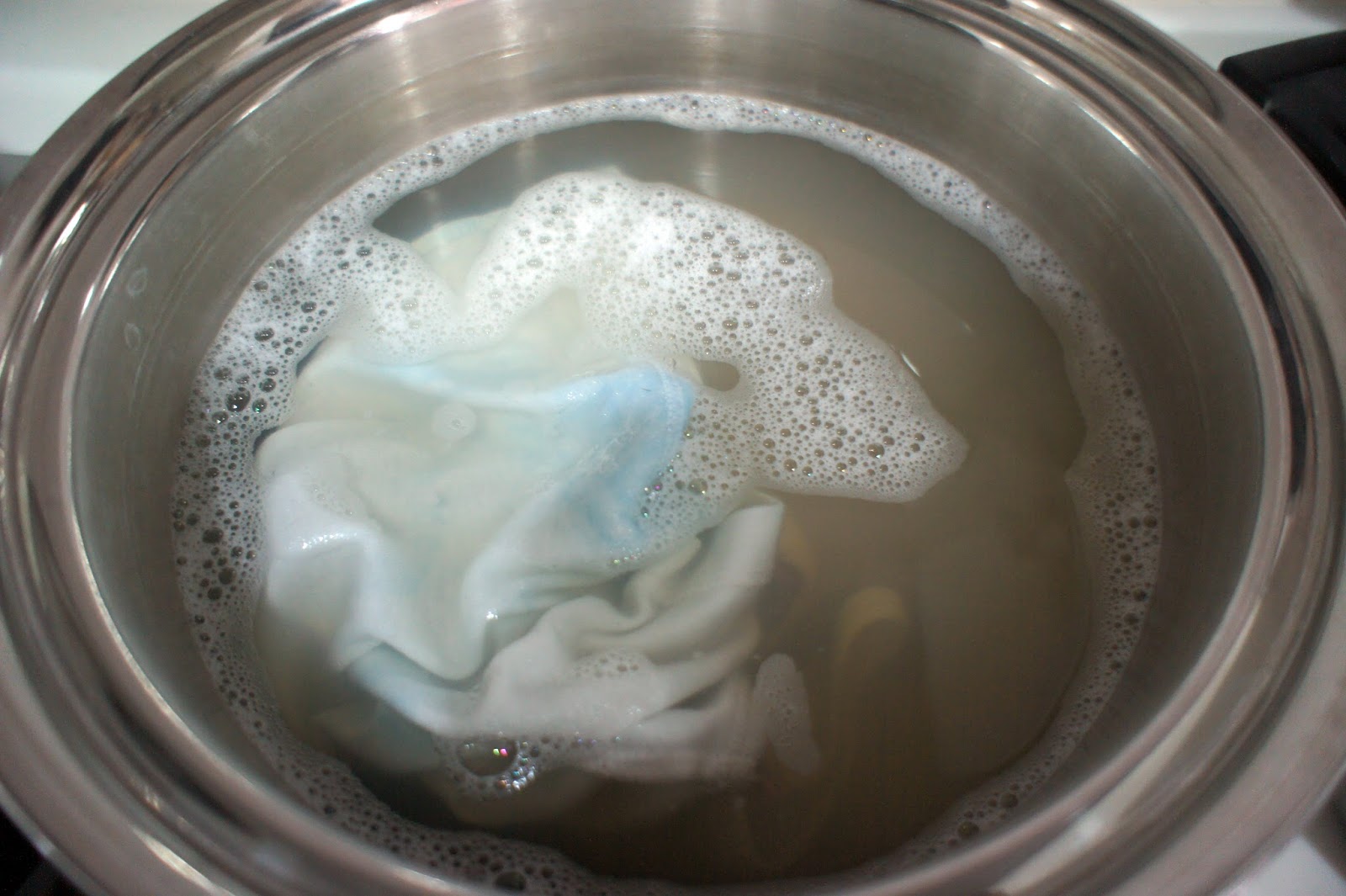 動作持續約五分鐘後,被染色部份就能被清除得一乾二淨(我煮了20分鐘,沒用.....)