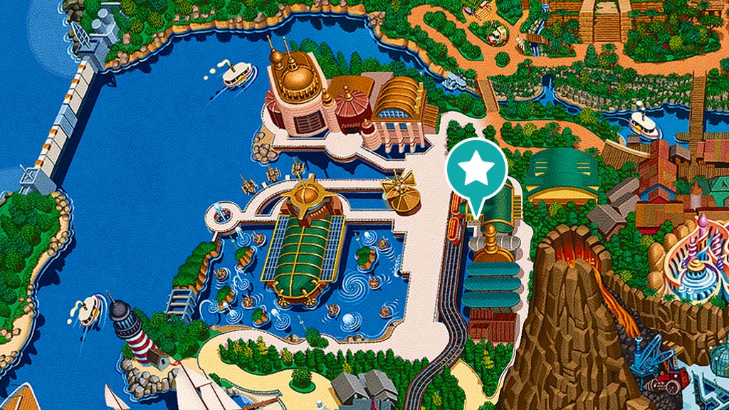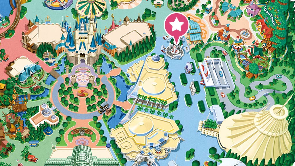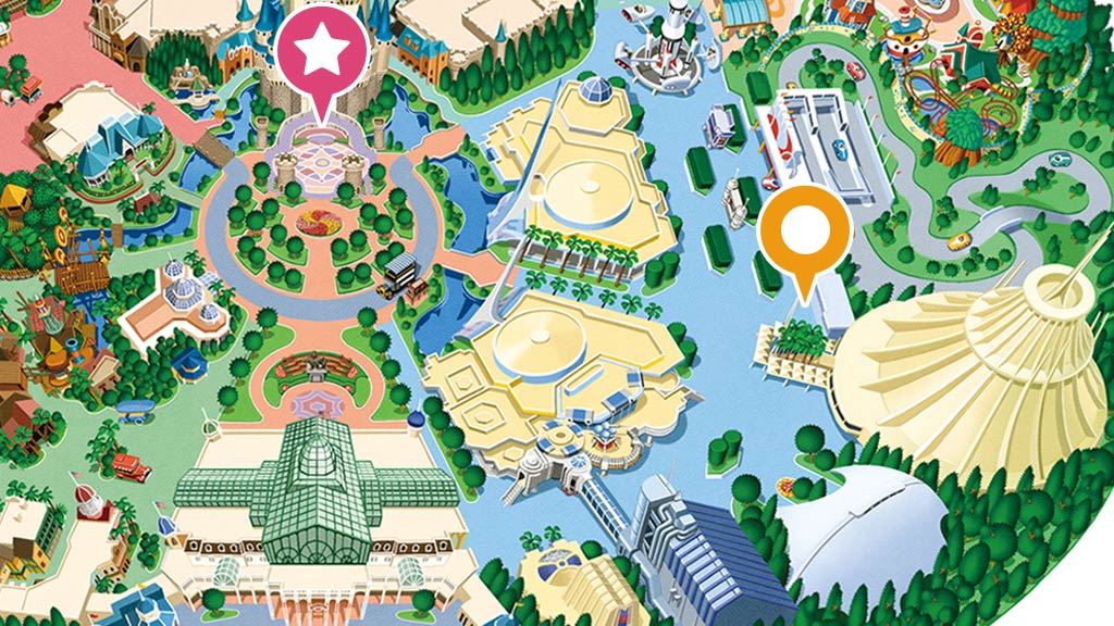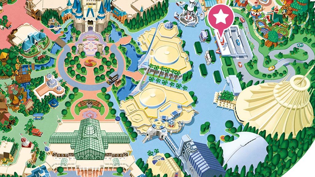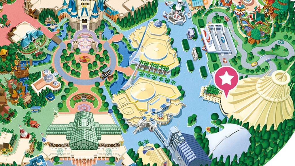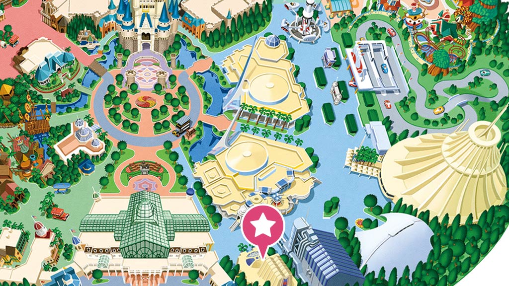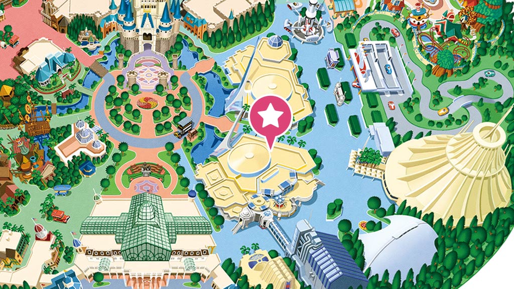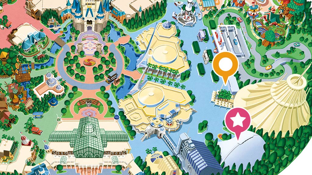 星際旅行-冒險續航:明日樂園,FP,本遊樂設施的快速通行券發券機設於明日樂園大廳旁(圖中橘色★處)(102 cm以上、音效聲響大、必須處於黑暗中)