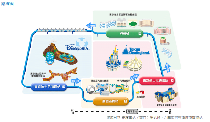 出JR舞濱站南口左轉就會看見左邊是東京迪士尼度假區迎賓中心(Tokyo Disney Resort welcome Center),入住官方飯店或公認飯店都可以到這裡事先托運行李、辦理入住以及領取周遊券(住樂園飯店才有),託運行李後可在旁邊搭單軌電車到迪士尼樂園或海洋玩