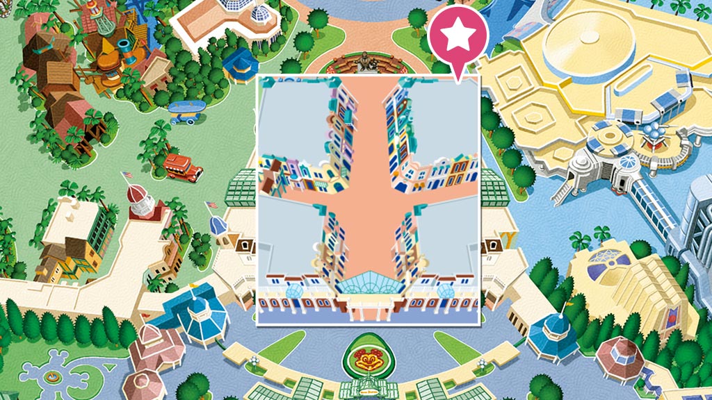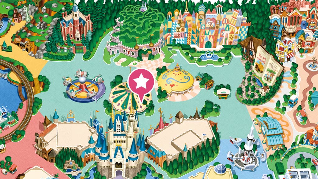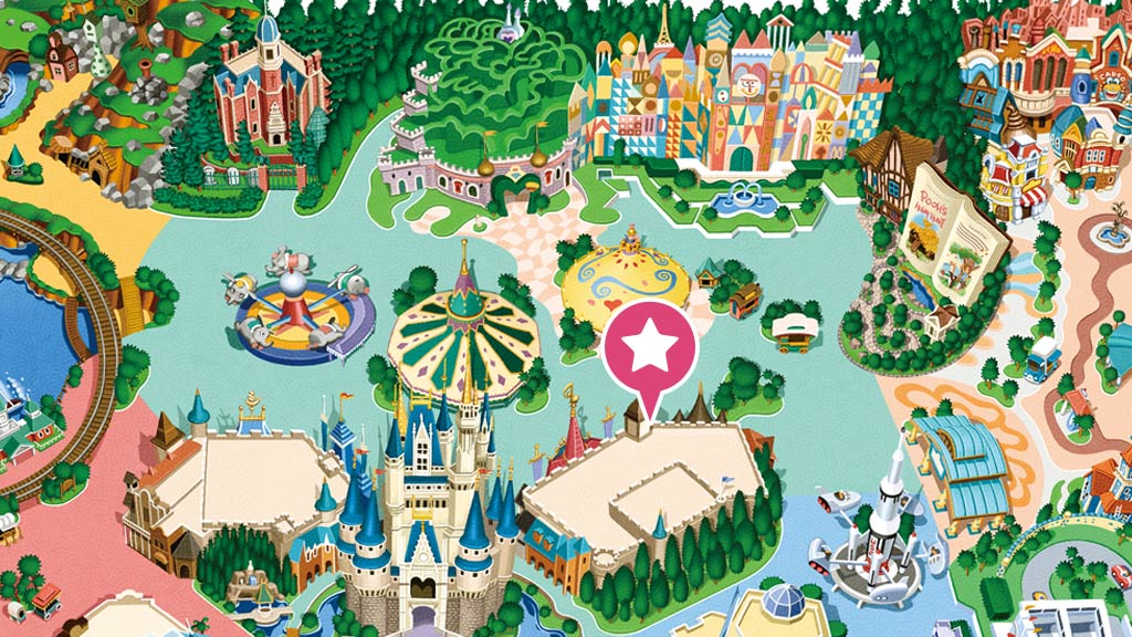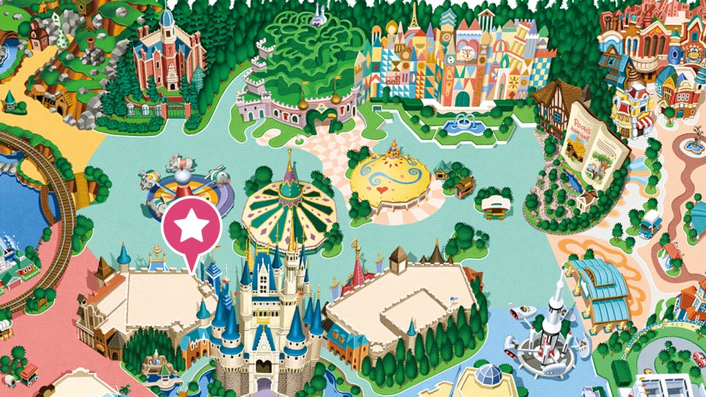 童話之夜:夢幻樂園,灰姑娘城堡(城堡前院,劃位入場券的抽選活動將自開園起於明日樂園大廳(地圖中橘色處)舉行,請讓未滿 4 歲的孩童坐在家長膝上觀賞節目)